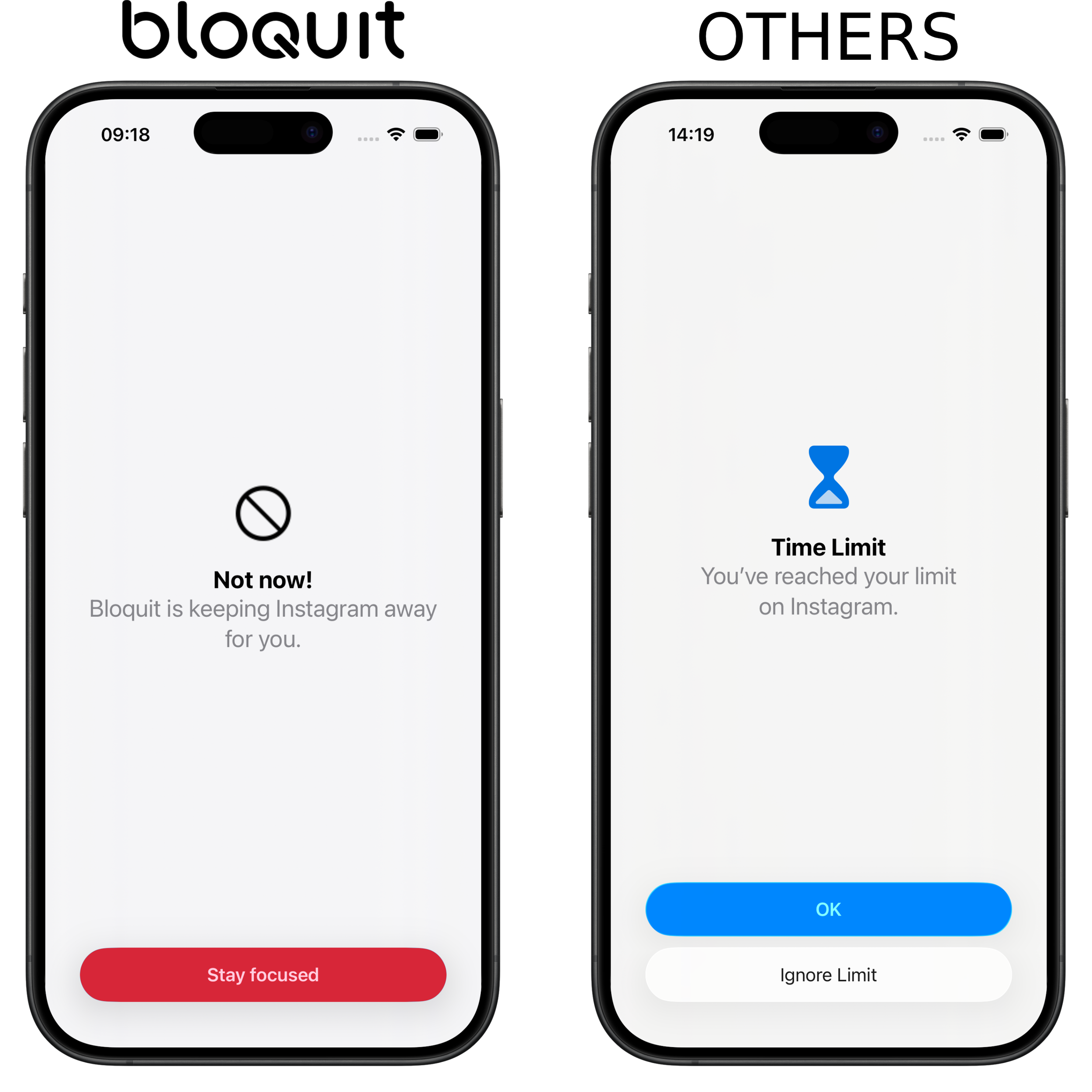 Screen Time is purely digital—you can always bypass it by ignoring limits. Bloquit adds a real-world layer of friction: the only way to unlock blocked apps is by physically tapping your Bloquit Tag. This makes it far harder to cheat and encourages intentional, mindful use of your phone.
